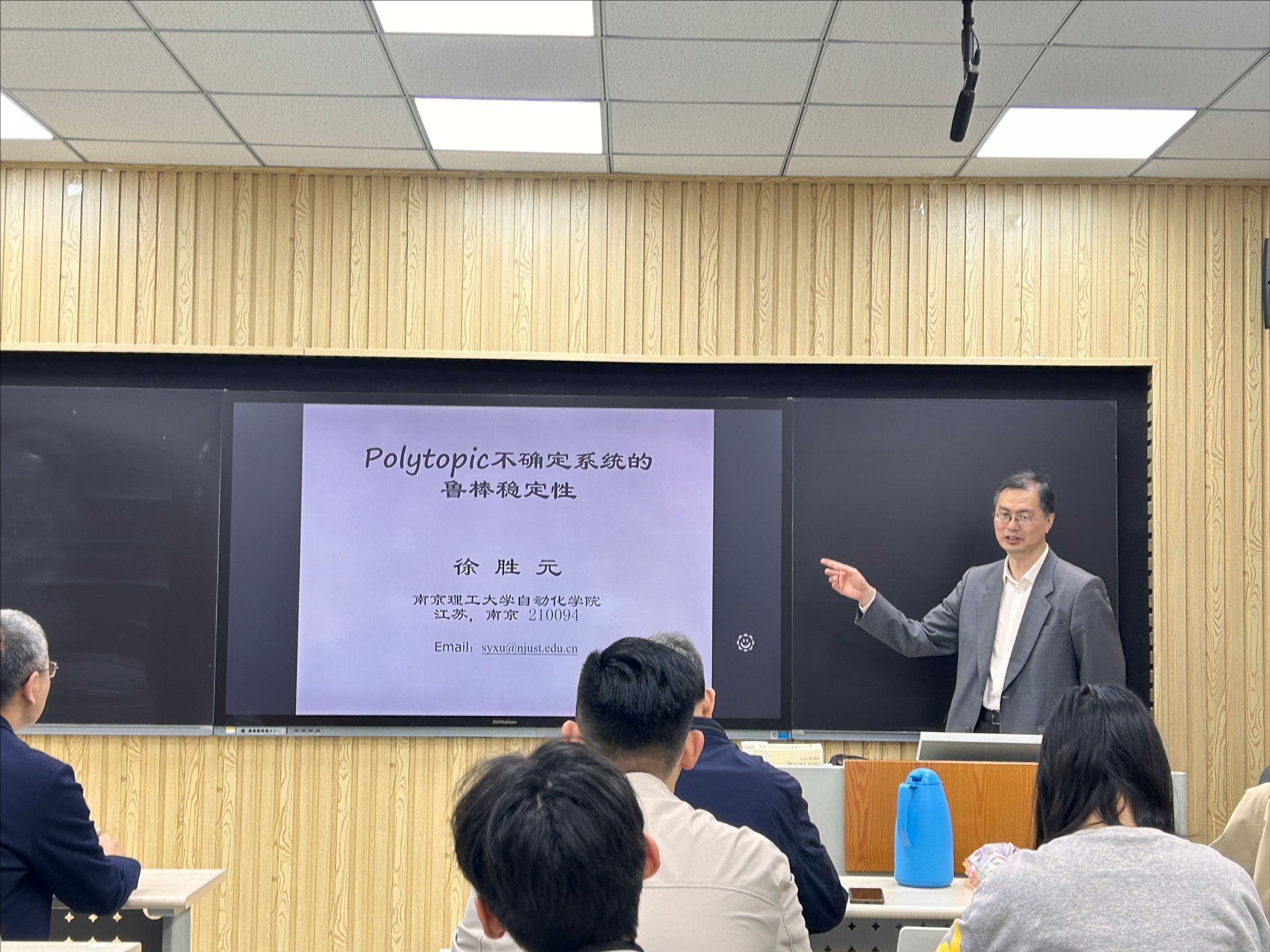 报告会上,徐教授对具有Polytopic不确定参数系统进行鲁棒稳定性分析,给出鲁棒稳定性判据,并对不同的鲁棒稳定性判据的保守性进行分析与比较。最后,徐教授热情地回答了师生们提出的问题。此次报告开拓了研究生的学术视野,提高了学生从事科学研究的积极性。