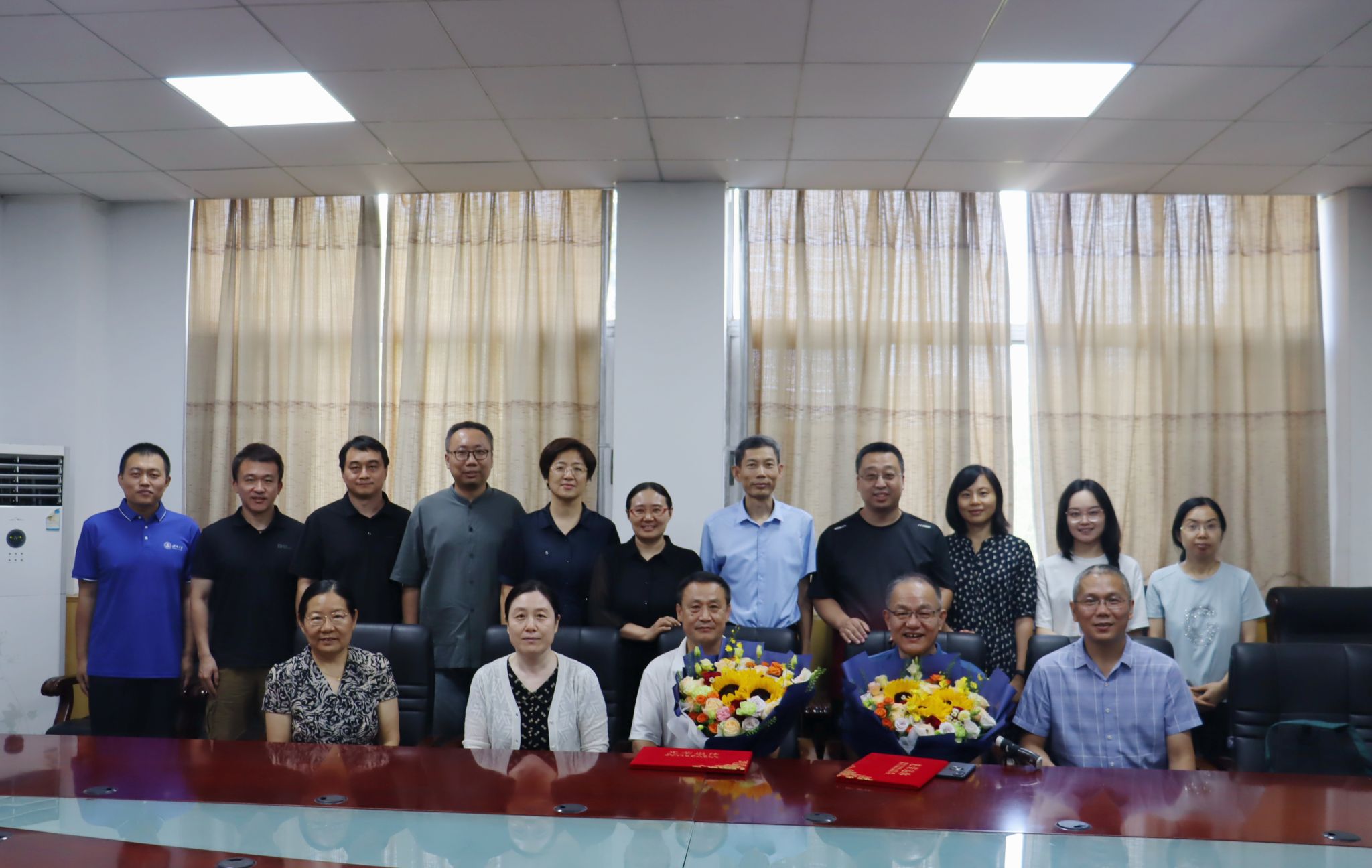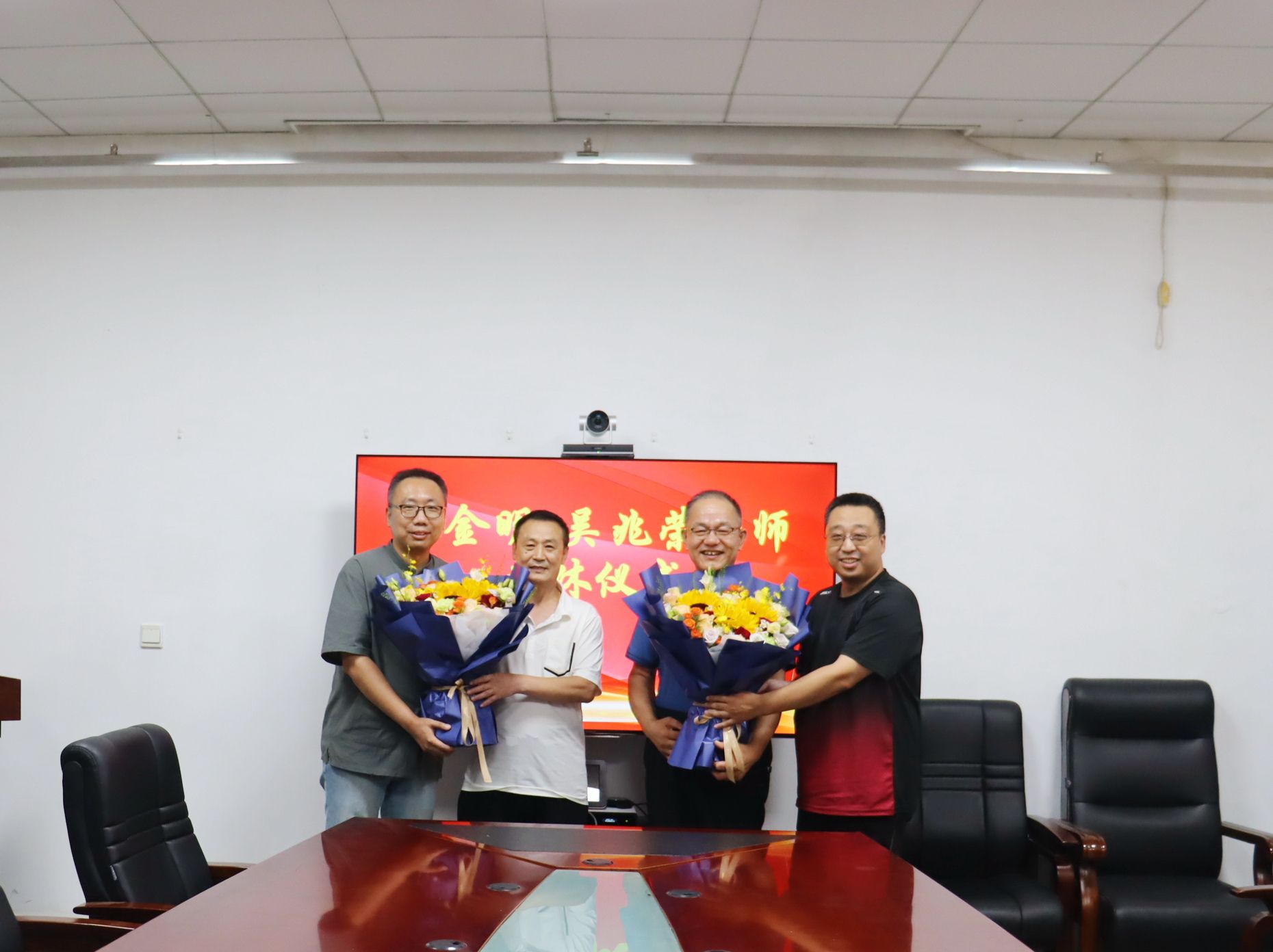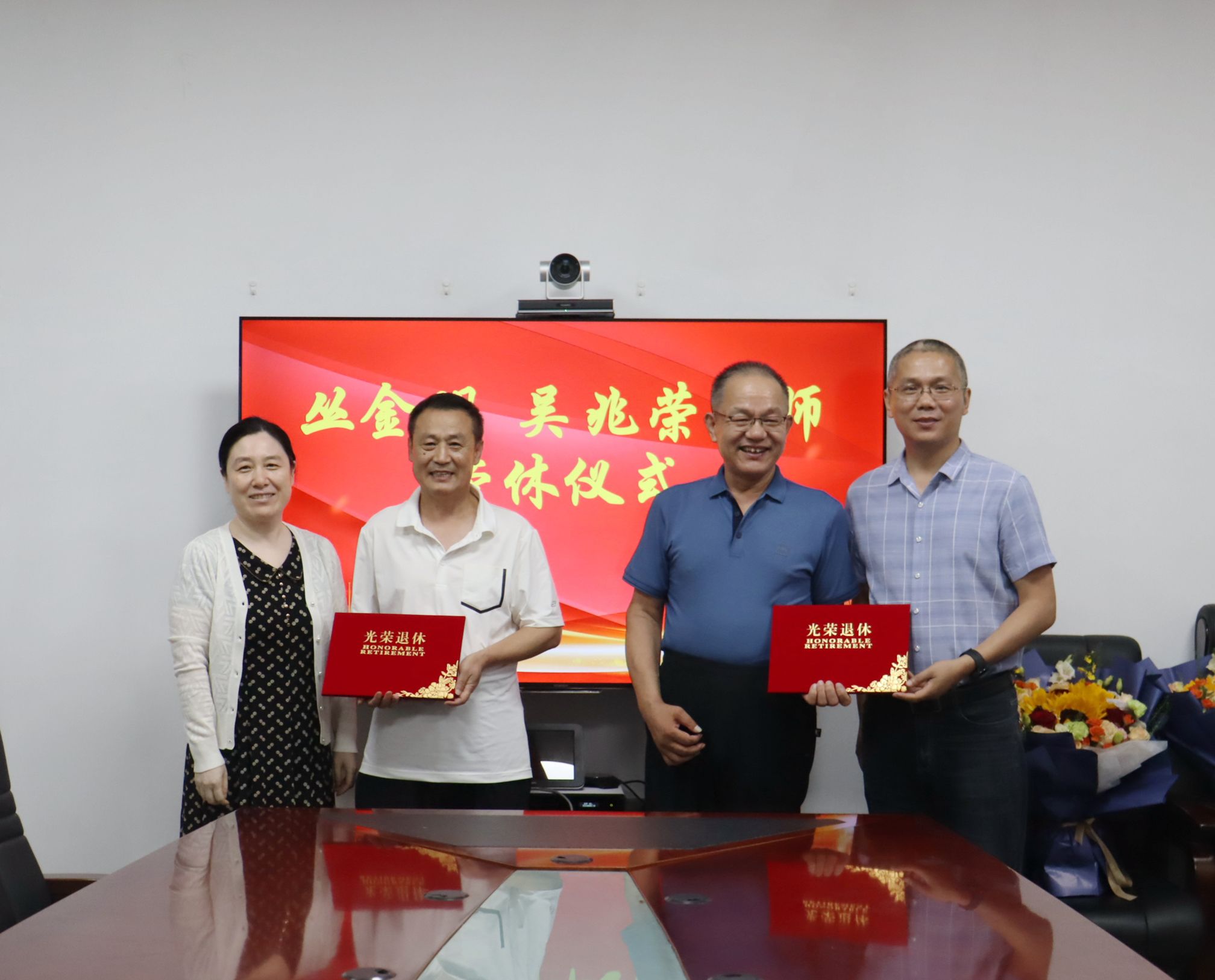 崔英静、孙元功为丛金明老师、吴兆荣老师颁发荣休证书,张超、陈斌等作为学生代表向两位老师送上鲜花和纪念品,祝愿两位老师退休后的生活幸福愉悦。