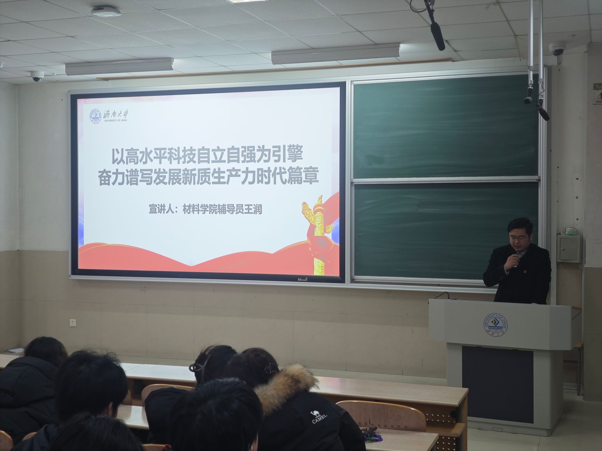 辅导员王润围绕“以高水平科技自立自强为引擎奋力谱写发展新质生产力时代篇章”展开分享,结合学科特色剖析科技自立自强对发展新质生产力的重要意义,鼓励青年投身科研创新;澳门赌场