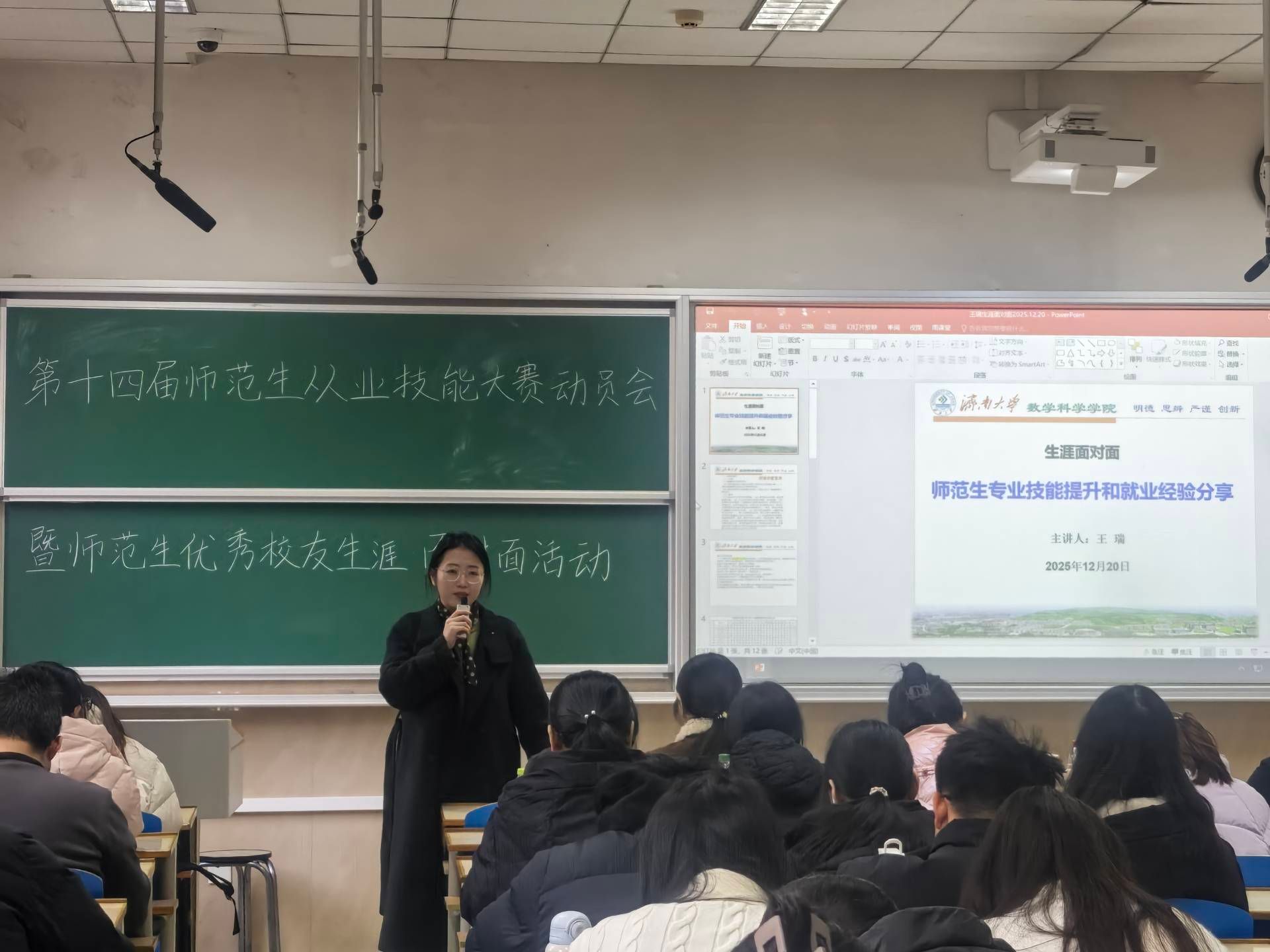 潘玮珊以自身师范生成长路径为切入点,结合教学实践中的真实案例,从专业课程学习、教学技能训练,到教招备考、师范技能大赛参赛的全流程经验逐一分享,为在场师范生梳理出清晰的成长提升路径。王瑞聚焦师范生教学、备赛、教招、考研四大核心要点展开分享,提醒同学们关注教育局官网公告,提前备齐报名材料,提升控场能力。参会师范生全程认真聆听,积极记录关键要点,现场交流热切。大家纷纷表示此次分享破解了求职备考的诸多困惑,收获了可直接运用的实战方法。