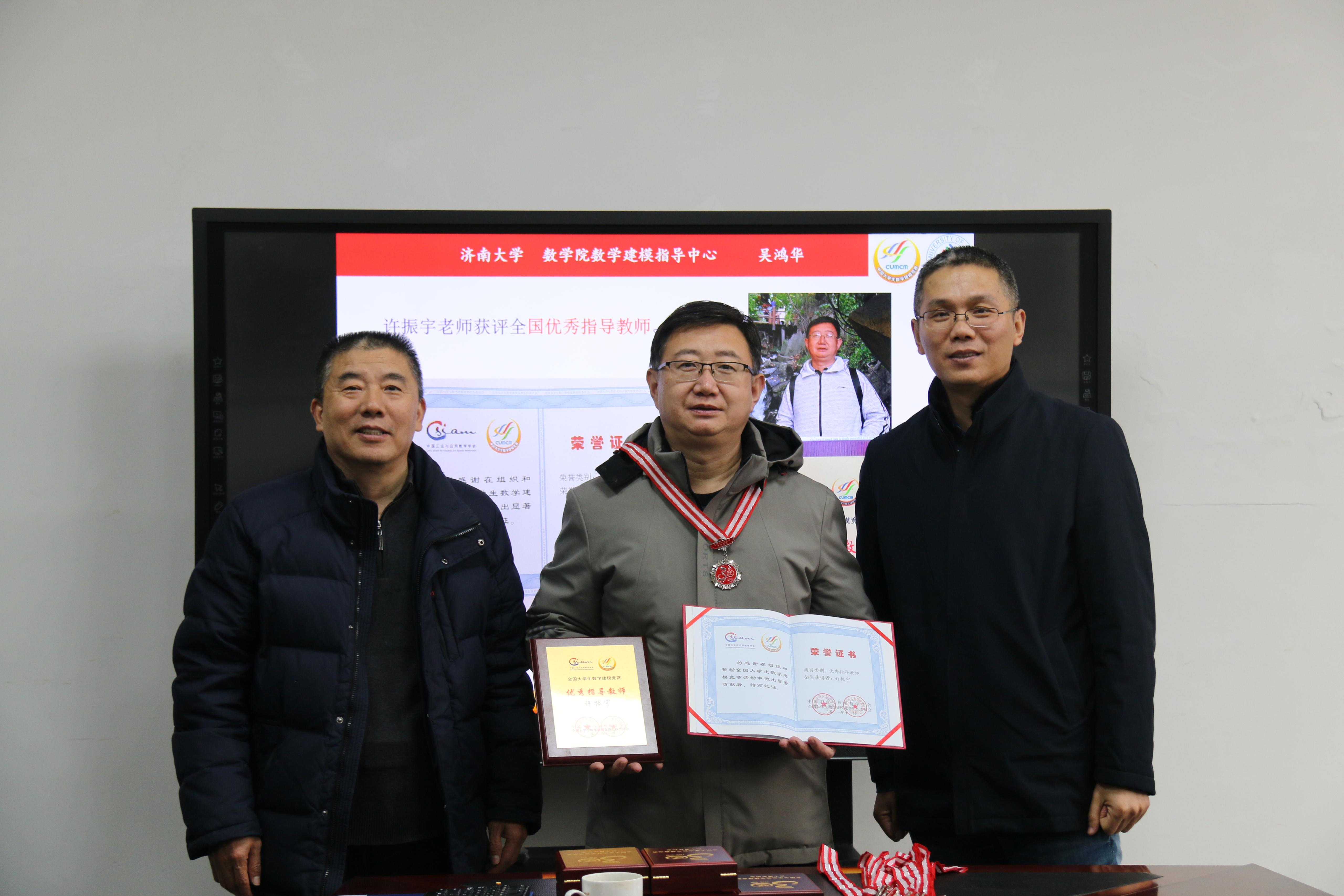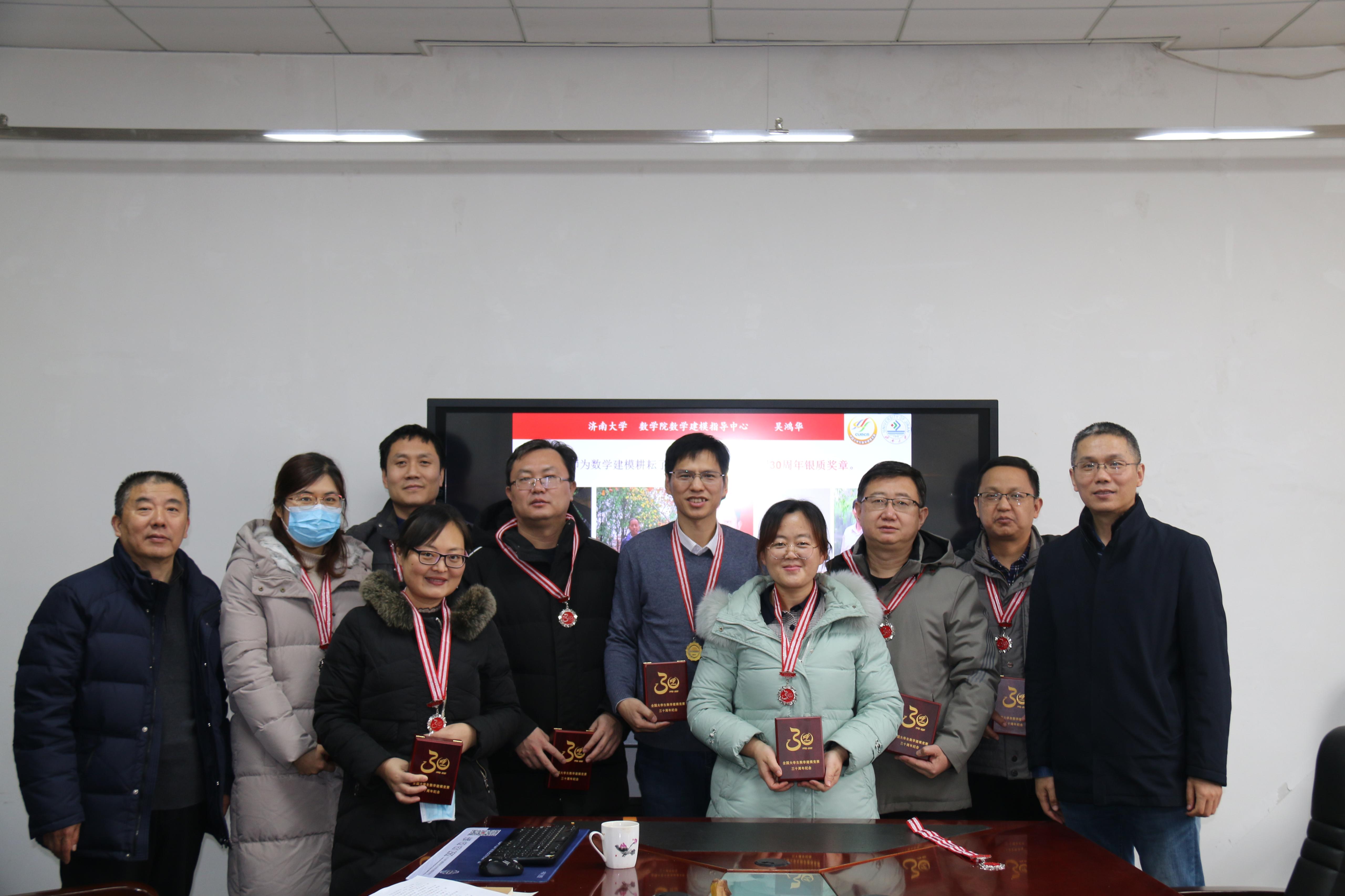 院长孙元功分别为全国大学生数学建模竞赛优秀指导教师获得者许振宇老师颁发了证书和奖牌,为数学建模默默耕耘15年及以上的许振宇、吴鸿华、孙鹏举、邱保建、李尚友、刘春燕、刘艳、屈忠锋、何燕玲等9位老师颁发了全国数学建模竞赛30周年银质奖章。