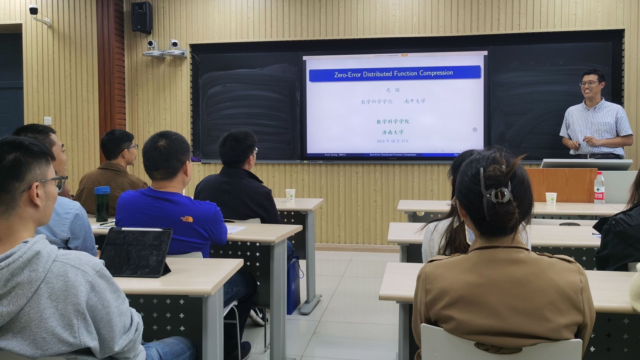 2007届数学与应用数学专业校友李同兴。专家学者们各自分享了他们在数学科学领域的最新研究成果和前沿动态,内容涵盖了多个领域,光炫教授在《Zero-Error Distributed Function Compression》中提出了两个二进制无内存源X和Y的零误差分布式函数压缩系统模型;周华成教授以《Recent progress in stabilization for uncertain systems described by PDEs》为题介绍偏微分方程描述的不确定系统稳定的最新进展;李同兴教授在《Oscillation criteria for second-order superlinear Emden-Fowler neutral differential equations》中介绍了二阶超线性埃姆登-福勒中立性微分方程的振荡准则。