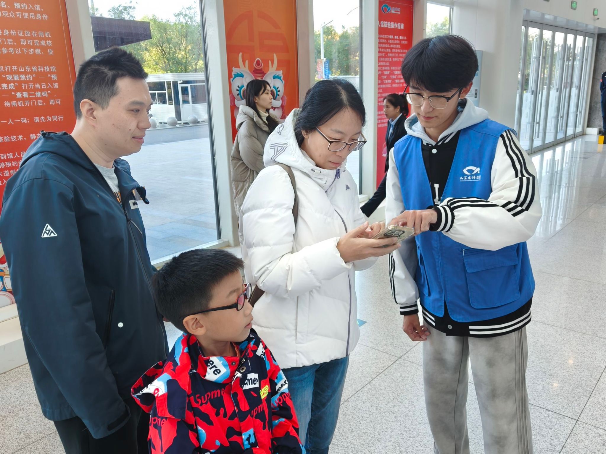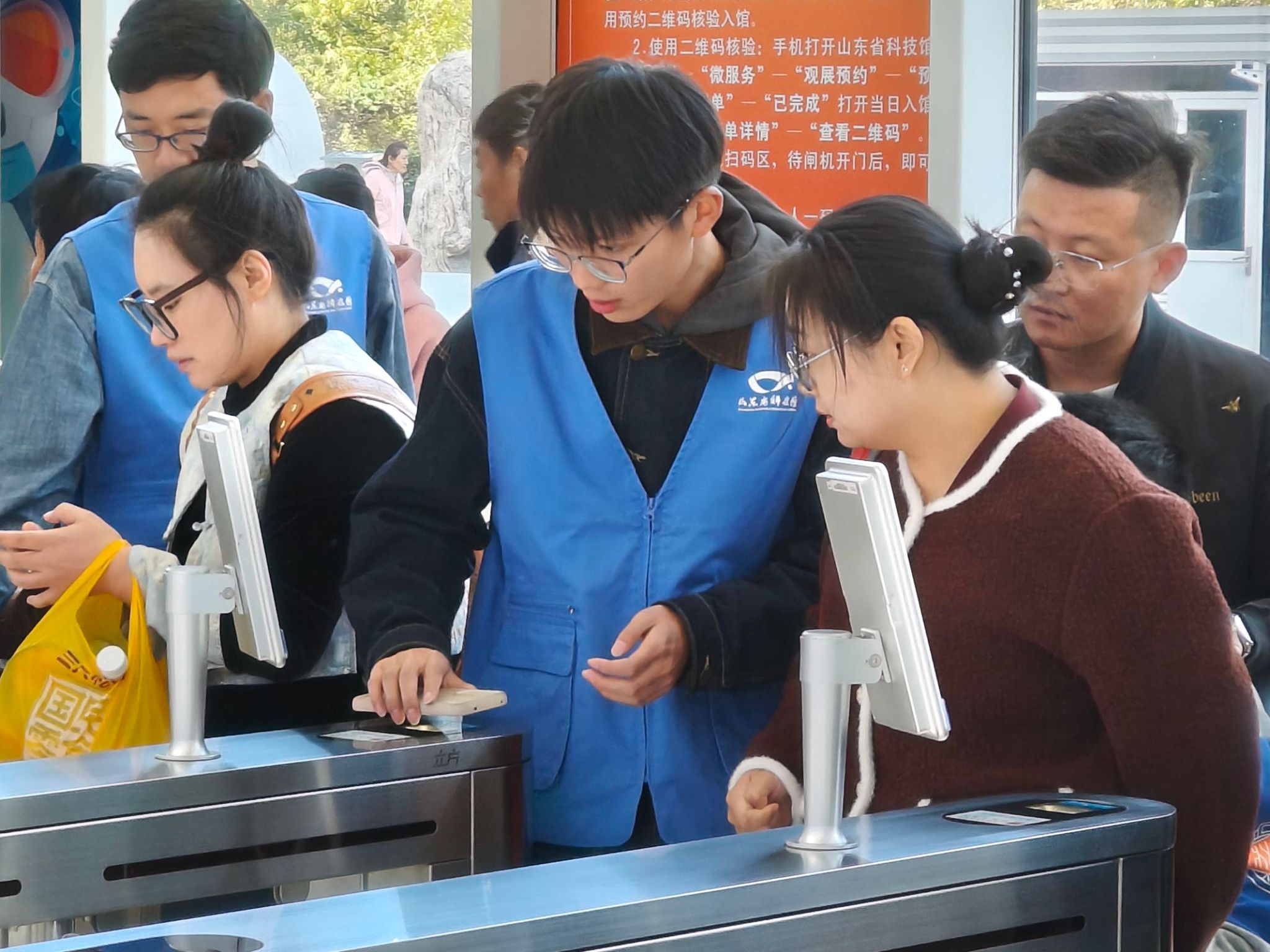 活动当日,志愿者们在山东省科技馆工作人员的带领和安排下,细致地熟悉了馆内的环境。随后,在服务过程中,志愿者们身着志愿服,有序分布于各展区为访客导览,并做好观众的安全保护工作。他们有的在科技馆入口处细致检票,引导访客有序入馆;有的为参馆者介绍馆内基础设施并耐心解答他们的疑问,为他们带来更好的参观体验。此外,志愿者们还协助技术部人员进行设备的日常检修,进行故障排除等工作,保障科技馆设施的正常运行。服务结束后,志愿者们表示不仅收获到了帮助他人的喜悦,锻炼自我的勇气,心怀社会的责任,同时也坚定了投身志愿服务活动的决心。