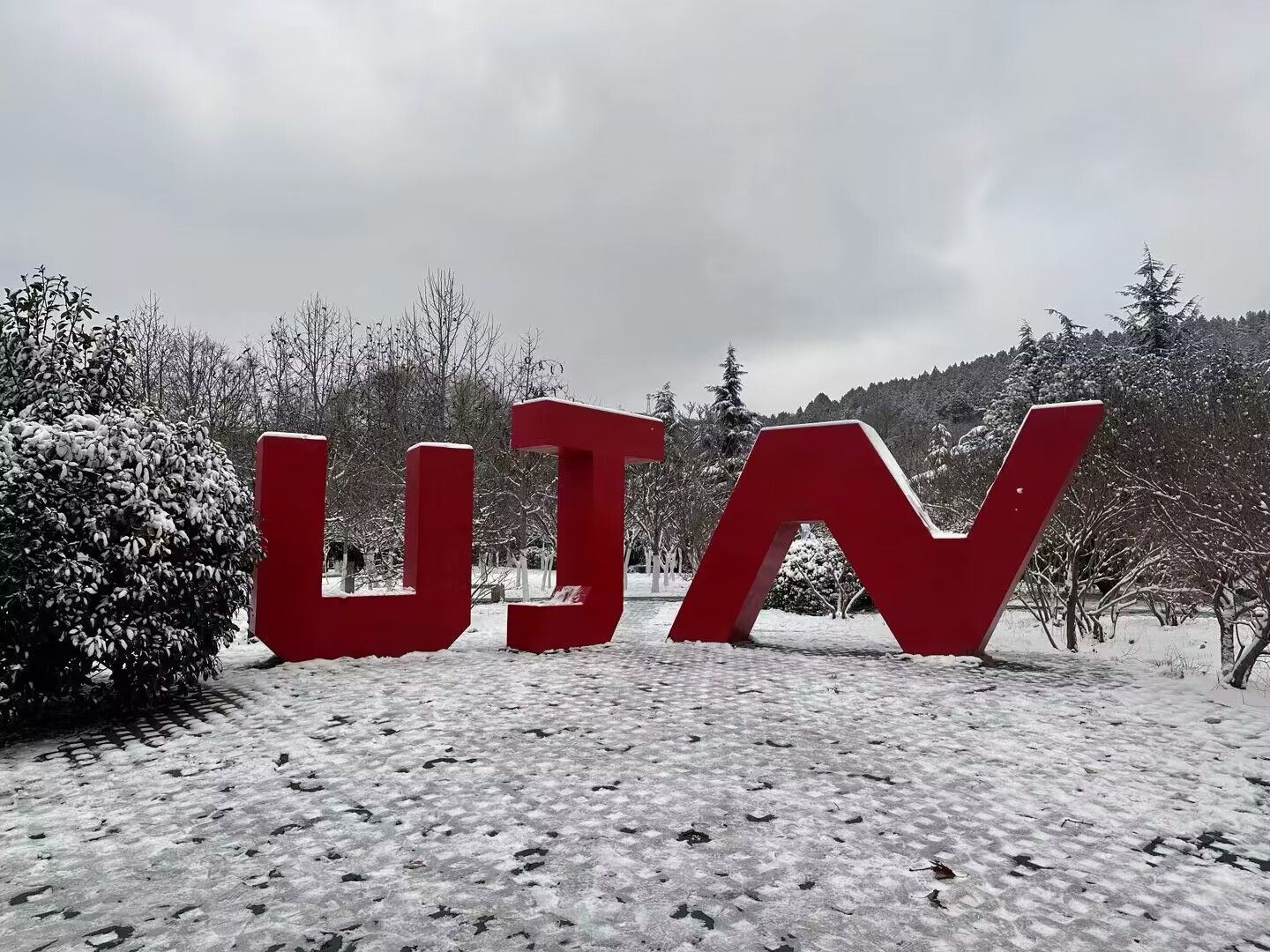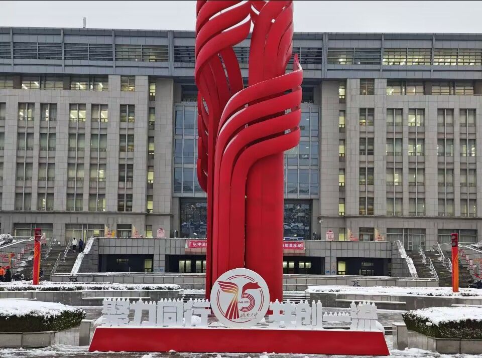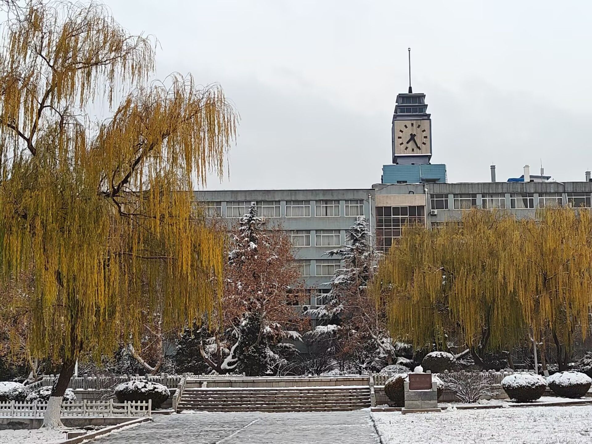 初雪飘临,教学楼静静矗立。飞絮洒落屋顶、窗台,似为其披上素白披风,冷峻轮廓在雪雾里渐趋柔和,二者相映,构成一幅校园冬景图。