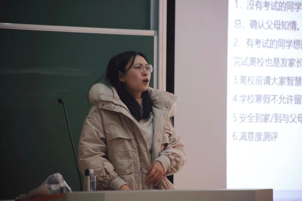 请假备案。最后,她还提醒同学们在寒假期间不要忘记学习,充实提升自我,重视心理健康,珍惜大学最后一个寒假,陪伴父母度过一个幸福且美好的假期。