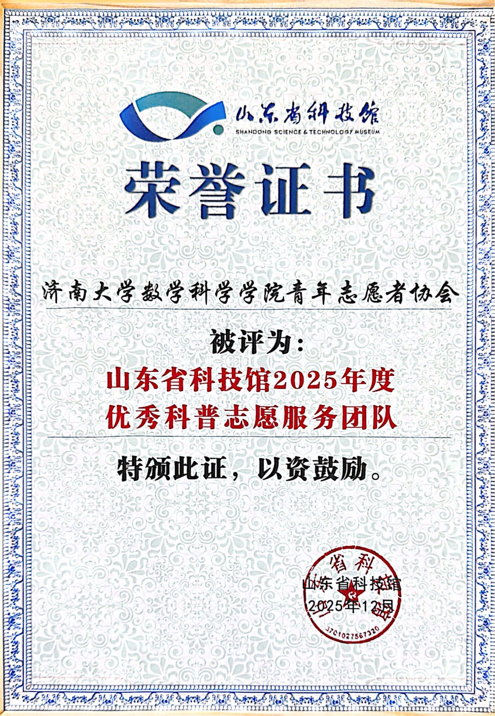 学生会青年志愿者协会主席田芮菡获评山东省科技馆2025年度优秀科普志愿者,充分彰显出数院学子的青春担当与志愿风采。