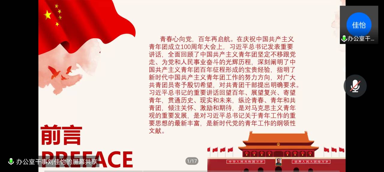 在活动开始前,同学们自主学习了习近平总书记在庆祝中国共产主义青年团成立100周年大会上的重要讲话。活动开始后,活动主持人领学了习近平总书记重要讲话,并表示,作为一名共青团员,我们要坚决听从党和人民召唤,在青春的赛道上奋力奔跑,争取跑出当代青年的最好成绩!随后,同学们就如何成为一名合格的共青团员展开讨论。数学2101班米浩杰认为:“作为新时代的青年大学生,我们要牢记习近平总书记的嘱托,珍惜时间,担负时代使命,在担当中历练,在尽责中成长。”数学2103班郑慧颖说:“历史的接力棒已经交到我们手中,我们唯有自信自强、主动作为、勇挑重担,才能把握机遇,奋发勇为。”最后,大家观看《有我》宣传片,共同感悟将青春小我融入祖国大我的时代精神。