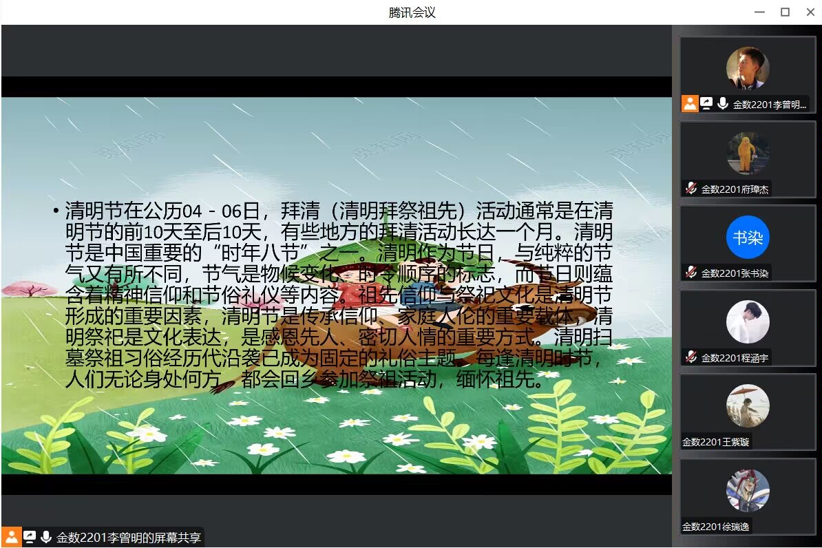 清明节主题班会的成功开展,不仅加强了同学们对中国传统节日的认识,还激发了同学们对革命烈士的崇敬与怀念之情,更加坚定了数院学子拼搏奋斗,决心报国的伟大志向。